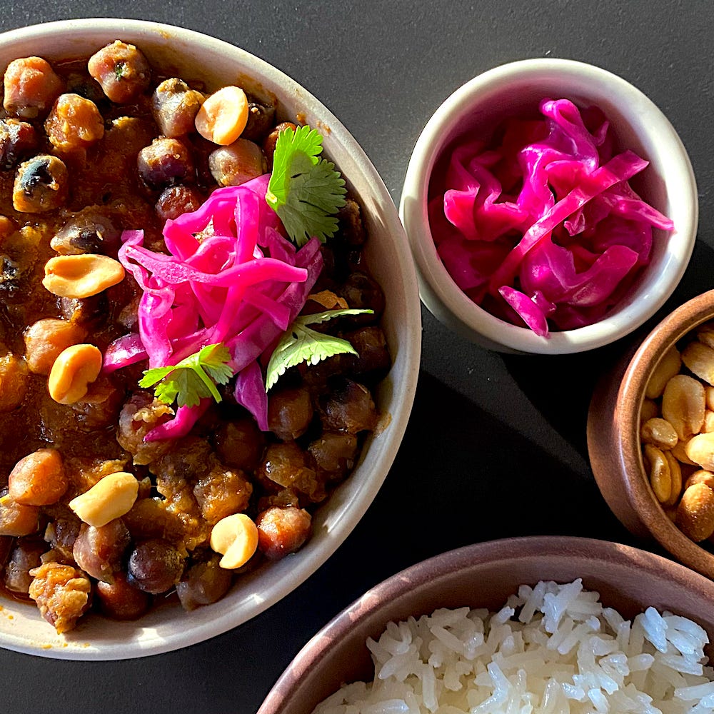 Carapulcra is an ancestral stew that my Quechua and Inca ancestors made with papa seca (dehydrated potatoes). Families that migrated from the Andes mountains to the coast brought the stew with them. Over time, creole cooks incorporated cloves, cinnamon, and anise. Today, Afro-descendant communities in the town of Chincha south of Lima prepare three versions: papa seca, fresh potato, or chickpea carapulcra—and all of them are part of the soul food of Black Peru. Here, toasting dry chickpeas adds smoky flavor and crunchy texture, native Peruvian hot peppers aji panca and aji amarillo give heat to the onion aderezo base, and five spice adds aromatics. Peanut butter makes the stew creamy, while agave and red wine provide balance and depth. Colorful pickled cabbage brightens the dish. Accompany the carapulcra with a side of steamed rice to absorb the stew’s savory juices.