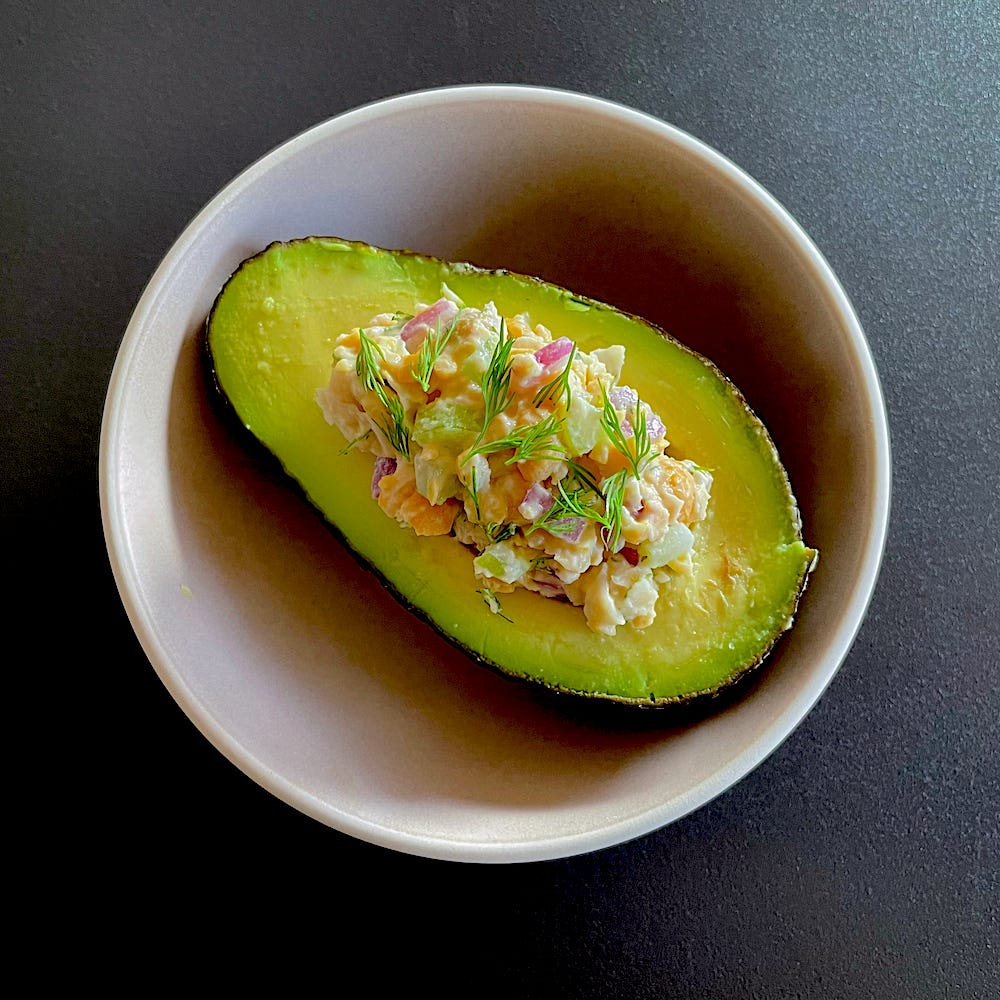 Fill each cavity with 1 tablespoon of the chilled chickpea mixture. Serve face up and garnish with dill. Squeeze a few drops of fresh lime juice over each avocado.
